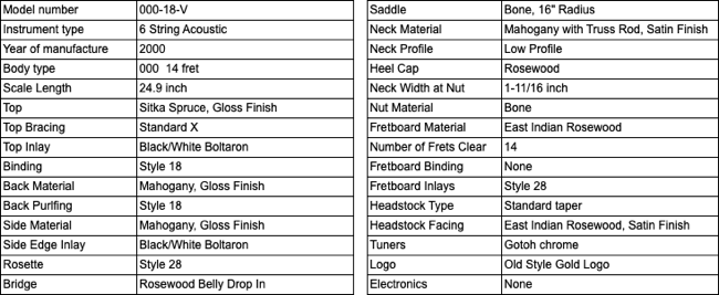 The 000 guitars have a short scale (24.5") and are well balanced for use in a wide variety of styles. My 000-18V shown below is a 2000 model with Sitka spruce top and mahogany back/sides. The aged toner top and tortoise shell pickguard give it a vintage look to go along with the classic Martin square solid headstock and logo. In my personal opinion the 000 and OM sized guitars are the perfect balance of size/volume and comfort/tone. You could play one of these guitars all day long. The neck is low fast action and the overall sound of this instrument will turn many heads.