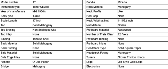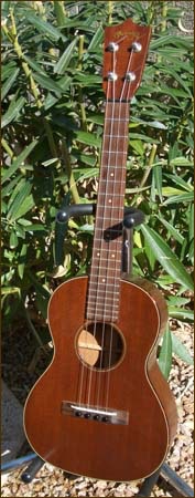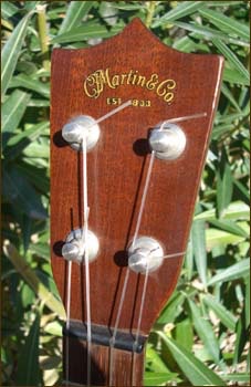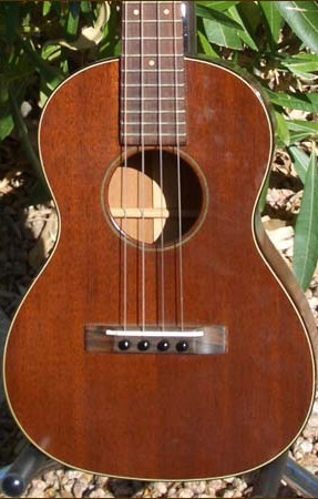 Tenor ukuleles were made by Martin from 1928 to 1977. The vast majority were produced in the Style 1 configuration (called 1-T) for the tenor. A few Style 3, 4 and 5 were made in the 30's and also some koa body tenors in the same period, but these are extremely rare. Shown below is my Style 1-T ukulele manufactured in the mid 1960's. The number of tenor ukes produced by Martin was very small compared to the sopranos. My 1-T features a body of solid mahogany as well as mahogany neck. Body binding is a beautiful tortoise shell material and rosewood fingerboard and bridge. Fitted with original Grover friction tuners, the neck is a very thin and fast shape.