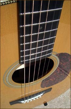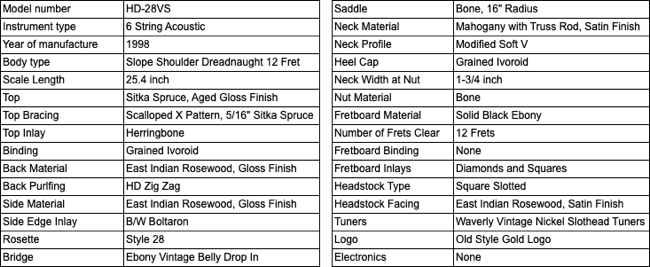 The HD-28-VS brings together some of the finest elements of Martins capability and is sonically one of my very favorite guitars. The body is a full D sized dreadnaught with sloped shoulders. This large cavity produces a thunderous tone. Soundboard is the finest Sitka spruce finished in aged toner. Sides and back are beautifully polished rosewood. The real significance of the HD-28-VS is the 12 fret neck, pushing the bridge right into the sweetspot of the top. The neck is 1-3/4 inch width at the nut and sports a beautiful slotted headstock finished in Waverly open gear tuners. This is one of the loudest, yet clearest guitars I have ever heard and produces a wonderful warm and mellow tone that is immediately identified as Martin.