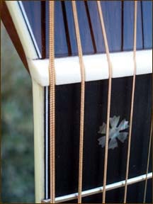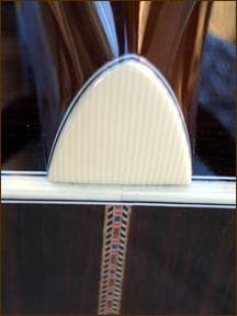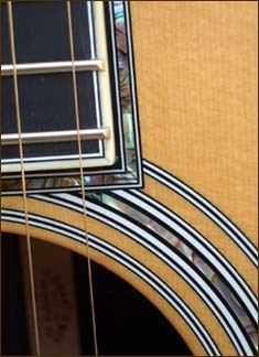 The OM is my favorite size guitar. Introduced long ago as the Orchestra Model, the OM is basically the same size as a 000. This wonderful guitar shown below is my OM-42. The 14 fret glossed neck is double bound in w/b/w trim with exquisite abalone snowflake position markers. The headstock is rosewood faced and bound in ivoroid, sports gold open gear vintage tuners and has the distinctive "C.F. Martin" pearl block logo down the center. Nutwidth is 1-3/4 inch. Top is choice Sitka spruce bound in abalone and grained ivoroid, including the perimeter of the fretboard extension. Back and sides are of course beautiful polished rosewood. My OM-42 shown below is factory fitted with the Fishman Eclipse Blend amplification system consisting of the Fishman Acoustic Gold undersaddle pickup and an internal high sensitivity dynamic microphone. Control under the lip of the soundhole includes a blend slider between these two sources.